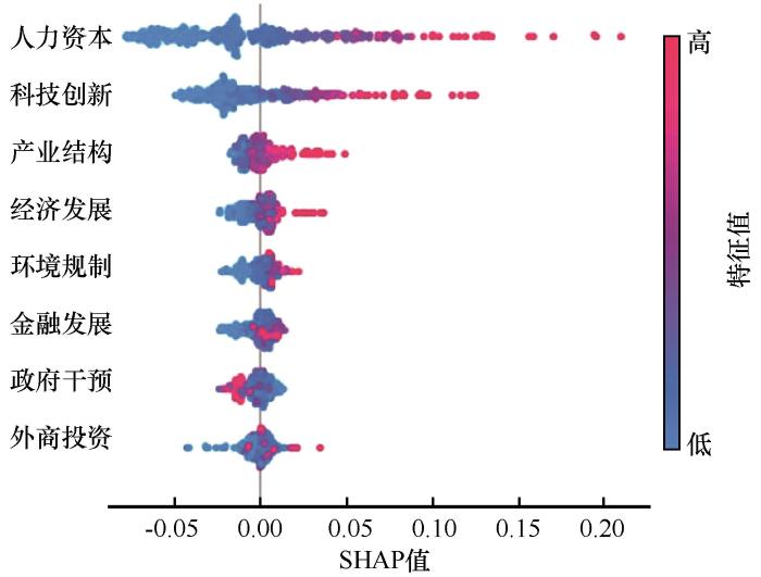 尽管SHAP均值能够衡量各变量的相对重要性,但无法直观反映各变量的具体作用方向。因此,本研究进一步绘制SHAP值摘要图,以揭示各影响因素对耦合协调的作用方向。经济发展、产业结构、人力资本、环境规制、金融发展、技术创新对旅游-生态-公共服务协调发展具有正向影响(图7)。经济发展水平越高的城市对旅游资源配置、公共服务建设和生态文明建设的调动力越强,近年来,中国大力发展绿色金融,金融资源向新兴的第三产业倾斜,进一步完善绿色金融服务体系,加强绿色金融产品创新,推动旅游业和公共服务获取金融资源,引导更多资金流向第三产业,推动绿色产业发展。产业结构升级是产业从低层次向高层次演变的过程,绿色、低碳产业逐渐取代“两高”产业占据主导地位,低耗能、高效率产业有助于降低经济增长对资源和能源的依赖。黄河流域是典型的生态脆弱区域,发展旅游业追求经济利益的同时,对生态环境造成了一定的损失,环境规制和产业结构升级可以有效推动节能减排和生态环境的恢复。旅游-生态-公共服务协调发展是一项系统性工程,离不开高素质的人才和技术创新,推动传统工业模式向新技术、新产业、新业态、新模式转变,充分利用大城市的虹吸效应,推动人力资本高度集聚,提高人力资本的创新转化效率。