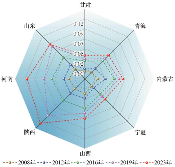 2008—2023年黄河文化旅游带文化旅游产业发展水平整体呈稳步上升趋势,其增长速度以2012、2015、2019年为重要节点,呈现增速起伏的阶段性特征(图1 )。2008—2012年的快速发展突出表现在对文旅发展要素的大力开发上。《黄河三角洲高效生态经济区发展规划》首次将黄河流域文旅资源开发纳入区域协调发展战略,推动旅游基础设施建设与旅游资源整合。陕西、河南、山西等省纷纷启动沿黄公路建设与核心景区打造。2013—2014年增速放缓反映出产业结构调整引致的供需结构性矛盾,沿黄城市过度集中于传统观光业态打造,供给体系难以适应消费结构变化。随着文化旅游产业结构动能转换过渡,2015年黄河文化旅游带进入新一轮快速发展阶段。《“十三五”旅游业发展规划》明确提出“黄河文化旅游带建设”,通过跨省协作,统筹文化遗产保护与线路开发,在用地审批、资金配套等方面强化政策保障,致使产业发展效应逐渐凸显。2020年面临疫情冲击以及从高速增长向高质量发展的转型压力,增速再次放缓,发展效应显著下降,但发展环境有所改善。2023年黄河文化旅游产业发展动能逐步恢复。