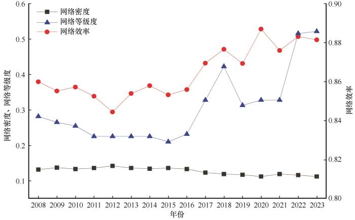 具体来看,2008—2012年,网络密度由0.131增长至0.142,表明区域整体网络关联程度逐步增强。2009年,黄河流域九省区秉持“协调发展、绿色生态、历史人文”开发建设理念,联合签署《黄河航运发展区域合作框架性协议》,在航道整治、港口建设等方面展开合作,为区域联动发展奠定交通基础。在2011年沿黄九省区黄河之旅旅游联盟第一次会议上,组建了中国最大的旅游联合体——中国“黄河之旅”旅游联盟,搭建重要交流平台与桥梁,联合发布系列沿黄旅游带精品线路等,关联网络初步构建;2013—2014年,整体网络密度降至0.134。文旅市场同质化竞争加剧与长效协调机制缺失等问题显现,盲目投资与重复建设导致产能过剩,掣肘整体效应释放,如四川若尔盖县、甘肃玛曲县、山西吕梁市等多地都在打造“黄河第一湾(弯)”品牌。在2015年网络密度到达峰值后再次回落,省域内部抱团发展现象频出,如山东成立“山东黄河流域城市文化旅游联盟”,郑州成立“郑州黄河文化旅游融合发展协作体”等。文化旅游产业发达城市与欠发达城市差距开始拉大,网络等级度与网络效率随之提升,表明区域间壁垒逐渐加深,各自为政现象依旧存在,导致区域发展的正外部效应受到抑制。同时,由于整体网络密度较低,城市节点联系普遍较弱,而网络效率较高,因此只有少数如西安、济南、郑州等城市通过资源整合、人才吸纳、产业集聚等方式,实现了文化旅游产业的快速发展和产业关联效应的逐步显现。