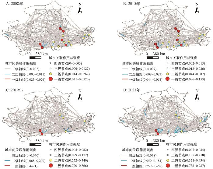 2008年黄河文化旅游带关联网络呈现省会引领、辐射周边的散落式扇形分布格局(图5 A),形成以少数核心城市为中心的扇形网络结构,较强联系主要建立在同省域内相邻城市间,跨省城市网络联系普遍较弱。如陕西形成以西安为核心,辐射咸阳、渭南、铜川的扇形网络结构。晋豫交界区则形成以郑州、晋城为主的双核结构,辐射至开封、新乡、焦作。山东形成以济南为核心,辐射至泰安、淄博的扇形网络。省会(首府)城市关联作用总强度普遍高于其他节点,黄河上游城市关联作用总强度与城市间关联作用强度均较低。这表明黄河文化旅游带网络节点发育不均衡,主要以高值节点带动周边节点,而高值节点较少的黄河上游则出现“孤立无援”局面。2015年,以中心城市为核心的扇形网络进一步发育,中心城市辐射范围不断扩大、辐射强度持续提升(图5 B)。如洛阳融入郑州-晋城的双核网络,渭南受西安辐射带动明显。同时,二级节点数量增加1个,三级节点数量增加4个,四级节点数量减少5个,网络节点的空间异质性有所减弱。2019年中心节点的产业关联效应得到强化,但非核心节点增长乏力,马太效应放大,高等级轴线与节点规模大幅缩减,并收缩为点轴网络格局(图5 C)。如一级节点减少4个,二级节点减少7个,三级节点减少9个,四级节点增加19个,省会(首府)城市的虹吸效应再度增强,低级别节点的空间异质性更加显著。2023年黄河文化旅游带关联网络格局重新呈现散落式扇形分布特征(图5 D),在文旅市场复苏过程中更重视区域协调发展。
