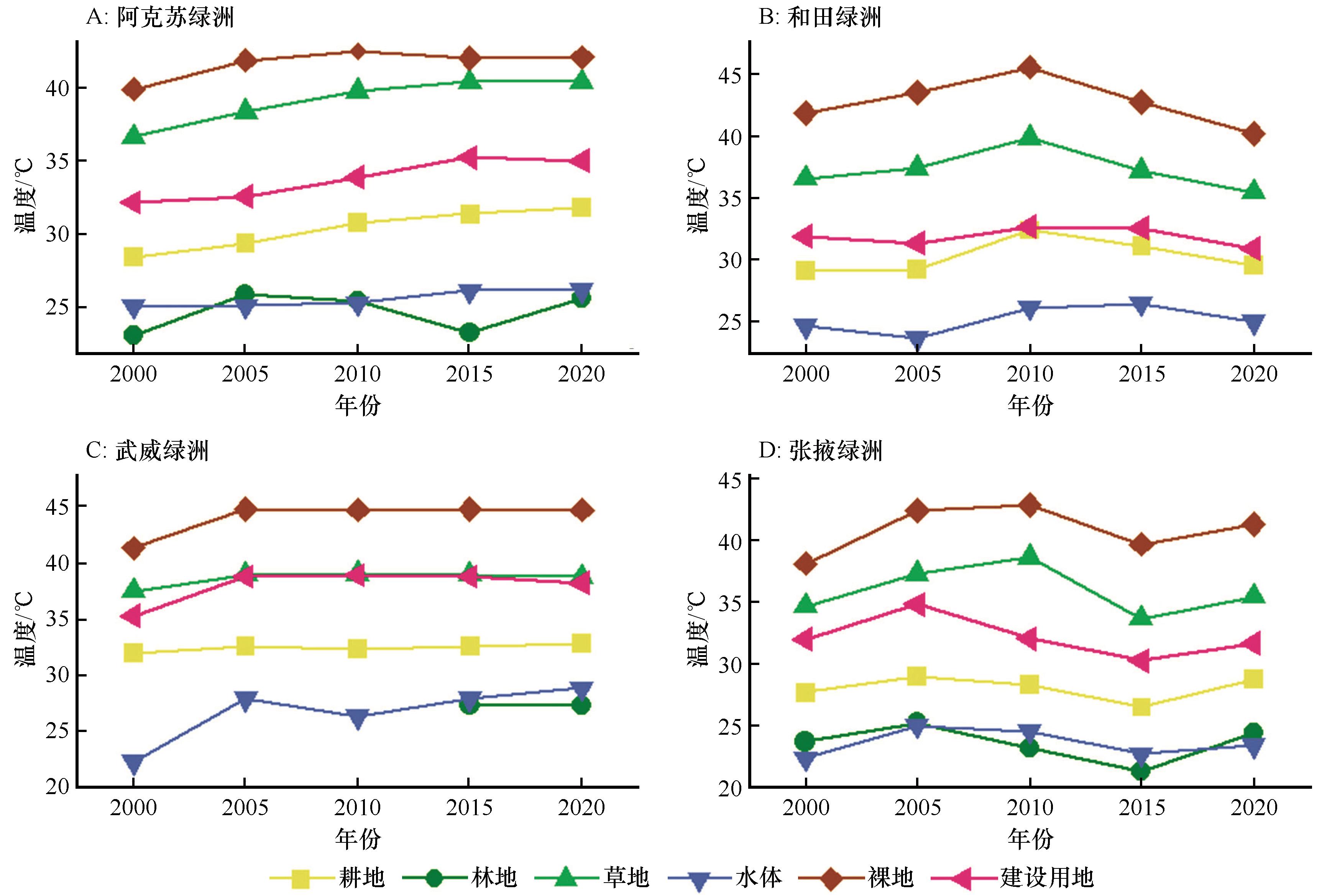 | 图7 各绿洲2000—2020年土地覆被类型地表温度 |