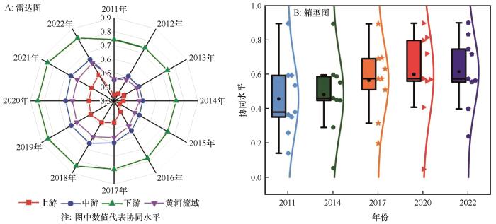2011—2022年黄河流域文旅融合与生态韧性协同水平雷达图及箱型图