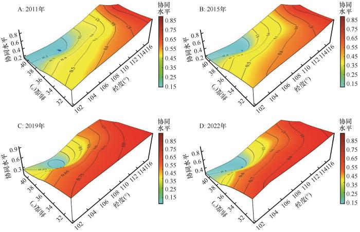基于哈肯模型检验流程,文旅融合水平为序参量,是驱动文旅融合与生态韧性复合巨系统向高效有序发展阶段演化的主要动力。从区域整体尺度看,黄河流域文旅融合与生态韧性协同水平由2011年的0.456攀升至2022年的0.613,以2018年为拐点,呈现出快速提升—平稳运行的协同演化趋势,尽管自2020年以来受外部特殊事件冲击,协同水平略有下滑,但整体增长趋势明显(图3)。一方面,《黄河流域生态保护和高质量发展规划纲要》《关于推进文化和旅游深度融合发展的意见》等政策文件为加大黄河流域生态环境的保护力度、推动绿色发展与文化旅游共生协调营造了良好的建设环境。另一方面,随着经济水平提升,文旅基础设施建设持续增强,加之生态友好的理念持续深入,生态旅游项目及绿色交通体系持续推进,进而在区域层面形成了两大系统的良性循环。