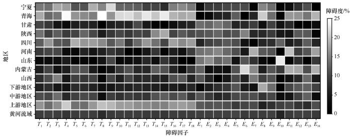 在地区层面,阻滞文旅融合与生态韧性优质协同的障碍因素差异显著(图6)。从流域角度看,障碍因子位居前列的为每万人拥有公厕数量(E5)、烟(粉)尘排放量(E4)、人均公园绿地面积(E13)及国际旅游人次(T17),障碍度前三的因子均集中于绿色发展与生态环境相关指标,这充分说明生态文明建设成为制约黄河流域文旅融合与生态韧性优质协同的短板,而受制于区位可达性、旅游知名度等原因,黄河流域旅游业在国际吸引力与创汇方面存在不足。上游地区主要障碍因子为文化及相关产业固定资产(T4)、旅游固定资产(T8)、文化事业费(T9),集中于文旅基础投入及绩效产出层面,这呼应了前文黄河流域上游文旅发展滞后于生态建设的测算结果,反映出上游地区文旅产业起步晚、用于文旅的资产投入存在劣势,文旅绩效产出及知名度也不具备优势,青海、甘肃、宁夏三省区尤为突出。中游地区主要障碍因素为艺术场馆数量(T3)、人均公园绿地面积(E13)、国际旅游收入(T15),表明普惠性设施、旅游绩效及生态绩效成为阻碍协同的重要阻力,亟待通过完善文旅基础设施、修复生态系统探寻可持续发展道路。下游地区主要障碍因子为工业固体废物综合利用率(E8)、建成区绿化覆盖率(E13)、人均公园绿地面积(E12),均为生态韧性层面指标,面临城市化快速推进及文旅发展引发的生态环境问题,提升生态韧性、坚持绿色发展道路是未来的着力重点。
