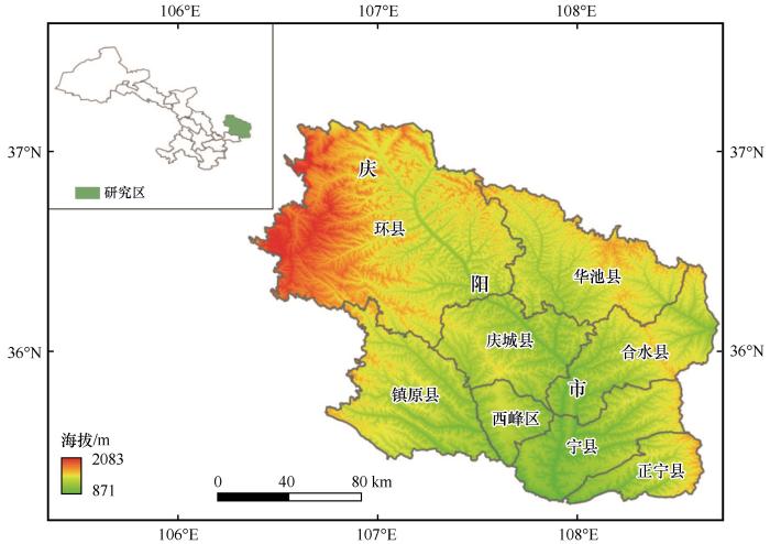 本研究选择黄土高塬沟壑区的典型代表甘肃省庆阳市为研究区(图1)。该区域位于甘肃省东部,地处黄土高原区,东接陕西,北临宁夏,是陕甘宁三省区的交界处。总土地面积为2.71万km2,辖1区7县。境内以黄土高原丘陵沟壑为主,海拔871~2 083 m,属温带半干旱气候,年均气温8~10 ℃,年降水量400~600 mm,集中在7—9月,主要河流有泾河、马莲河等河流。该区域是黄土高原水土流失严重区,能源开发与生态保护的矛盾突出。子午岭林区是重要的生态屏障,但整体生态环境仍较脆弱,面临水资源短缺、能源开发与生态保护等矛盾挑战。