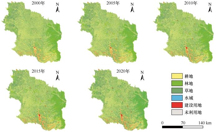 2000—2020年,研究区土地利用格局经历了明显调整,呈现出生态用地扩张、农用地优化、建设用地增长、未利用地压缩的总体演替趋势(图2)。耕地占比从2000年的约38.94%下降至2020年的35.66%,林地占比由11.55%增至13.08%,建设用地占比从1.10%提升至1.66%,草地总体增加了1.16%,反映了区域生态恢复政策实施、城镇化推进及土地资源管理策略变化的综合效应。