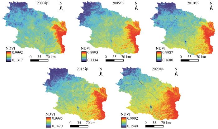 归一化植被指数(NDVI)是反映地表植被覆盖度和生态系统活力的重要指标,对区域生态敏感性判别具有重要意义。基于2000、2005、2010、2015年和2020年NDVI数据,对研究区20年间的植被覆盖变化趋势进行分析(图3)。
