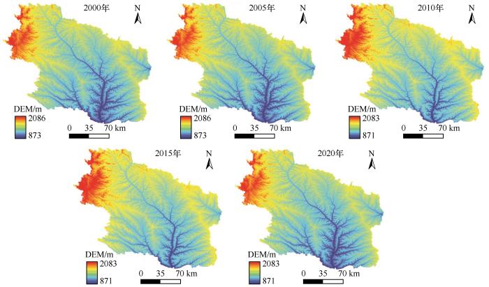 从五期DEM数据分析可见,研究区在2000—2020年的高程维持在871~2 086 m,极值未发生变化,空间分布格局保持稳定。这表明研究区在近20年间未经历大范围地貌重塑过程,如构造运动、滑坡或大规模塌陷,地形演变总体受控于长期地质演化过程,具有强烈的稳定性与继承性。