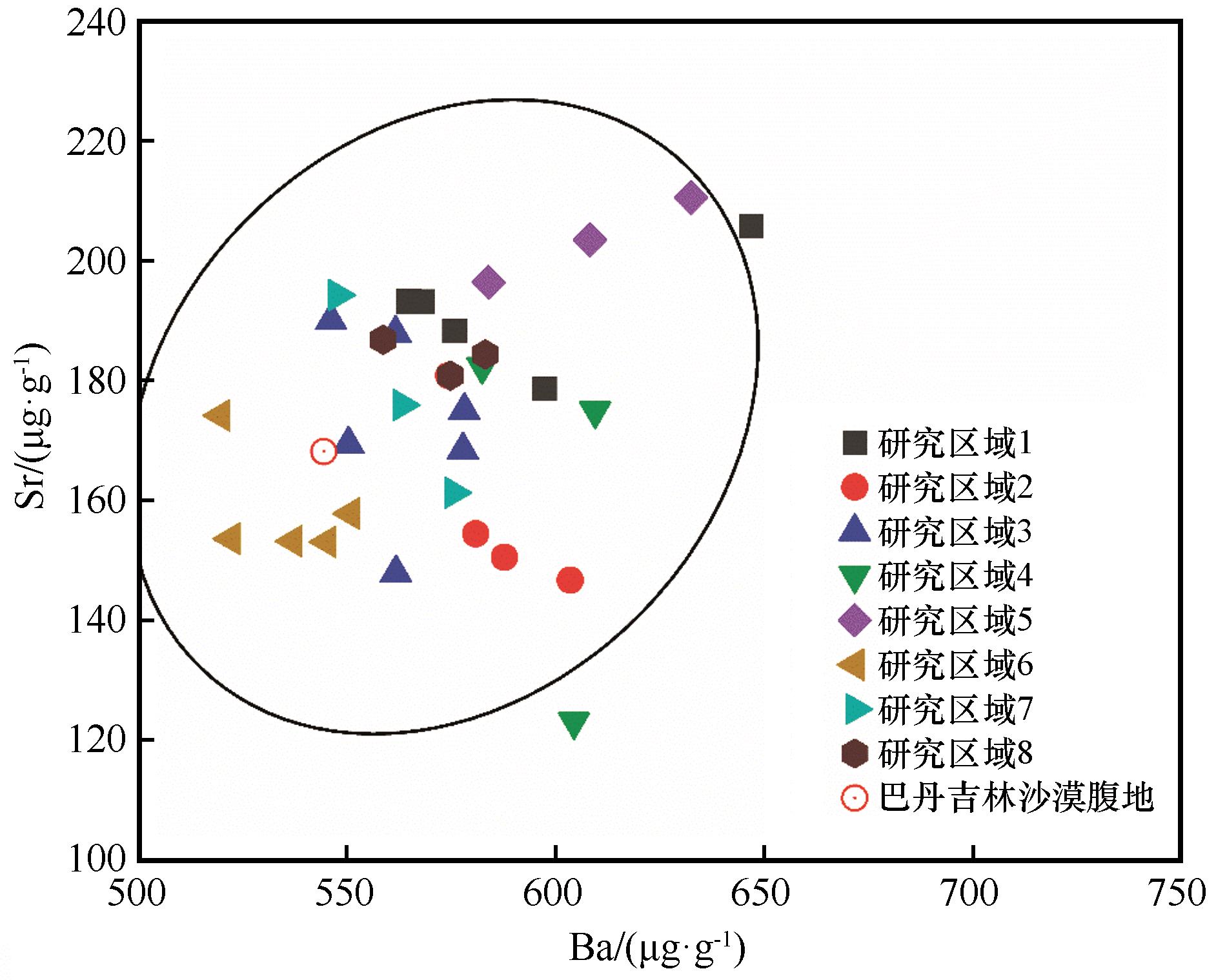 | 图6 研究区域表层沉积物微量元素Ba-Sr含量散点图 |