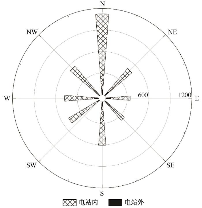 电站内外起沙风向具有一定变化。电站外呈一主(NNW-NNE)两副(W,E-ESE)的三峰型风向特征,而电站内呈窄单峰型(NNW-NNE)风向特征(图4 )。受光伏电站影响,近垂直于光伏组串长轴方向的次级起沙风向消失。