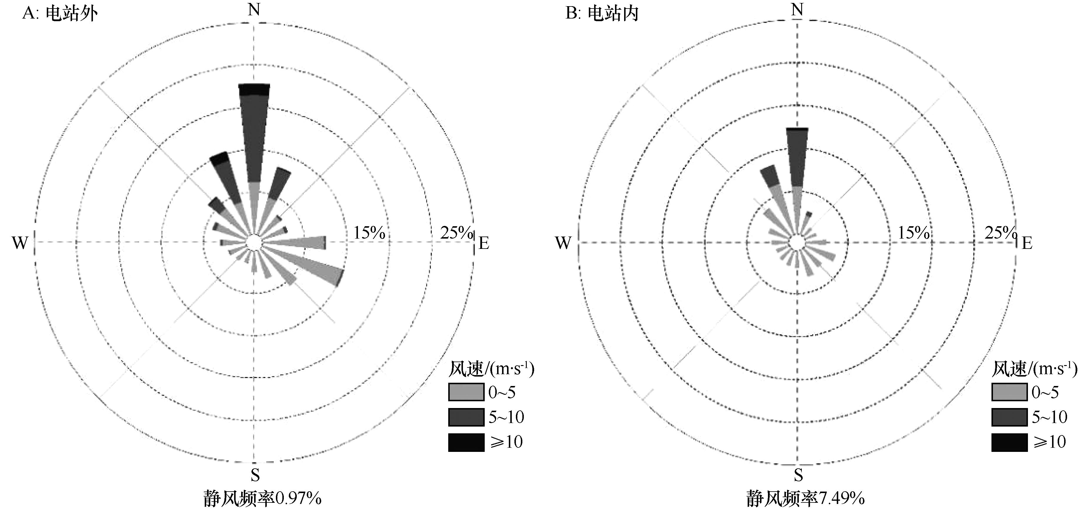 | Fig.3 Annual wind roses outside (A) and inside (B) the PPS |