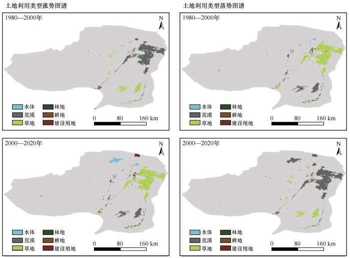 图5是各土地利用类型在阶段1(1980—2000年)和阶段2(2000—2020年)的涨落势。2000年之前,东河沿岸、居延海及古居延绿洲的荒漠增加而林地、草地及水域减少,西河上游及古日乃湖西部地区的草地增加而荒漠减少;2000年之后,变化趋势正好相反。地类发生变化的主要区域为东西河两岸、居延海、古居延绿洲遗址区域及古日乃湖区。