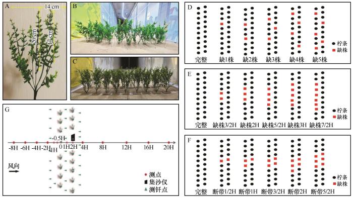 防风固沙林结构对其防风效应的影响是防护林的研究热点。风洞试验和数值模拟技术的应用是揭示林带结构对防风固沙作用影响的重要方法,分析了林带宽度、密度、高度、疏透度、植物排列和分布[12 -16 ] 对风速削减和流场分布的作用机制。行带式结构的防护林在防风和固沙方面效果较佳[17 ] ,且疏透度为40%~50%的林带可有效兼顾风速削减与通风效果[18 -19 ] 。在防风固沙林的经营管理过程中,由于种植密度、缺乏有效抚育更新等,野外林带缺株和断带现象普遍,林带的间隙或残缺的部分会显著降低其防风固沙效果。当防护林中出现开口时,由于漏斗效应,通过这些间隙的风会加速,可能导致湍流和风蚀。防护林林带结构中存在的缝隙,如植物缺失或部分受损,会减弱防风固沙林的整体效果[20 ] ,会降低防风固沙林的防护效益,甚至带来负面效果。当林带缺株和断带达到一定程度时,会显著改变林带结构,降低防风固沙效应,从而削弱防风固沙林的作用。防风固沙林外层第一带、第二带林带出现残缺时对防风作用影响最明显,行带组合在中间残缺时依然具有累加防风效果[13 ] 。在前期野外调查发现,杨树林、乌柳林、沙枣林、柠条林的缺株、断带现象十分普遍。由于迎风侧林带最先直接接触气流,迎风侧林带的缺株、断带现象更多。因此,本文分析防风固沙林迎风侧林带的结构完整性对防风效应、输沙率、固沙效应、积沙形态的影响,研究其对防风固沙能力的影响及如何优化现有的迎风侧完整结构受损林带。