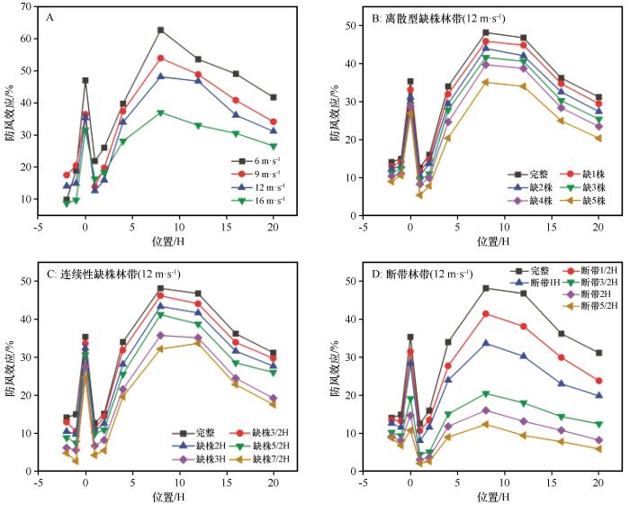 无论是林带前、林带间、林带后,不同缺株数量的林带的防风效应变化趋势基本相同。不同缺株数量林带在整个测量范围内的平均防风效应分别为28.9%、27.3%、25.6%、23.9%、22.3%、19.4%,平均防风效应与缺株数负相关,且当林带缺5株时防风效应小于25%;不同缺株数量林带的防风效应较完整林带分别减弱5.4%、11.9%、18.1%、22.8%、33.9%,当林带缺5株时防风效应减弱超过30%。