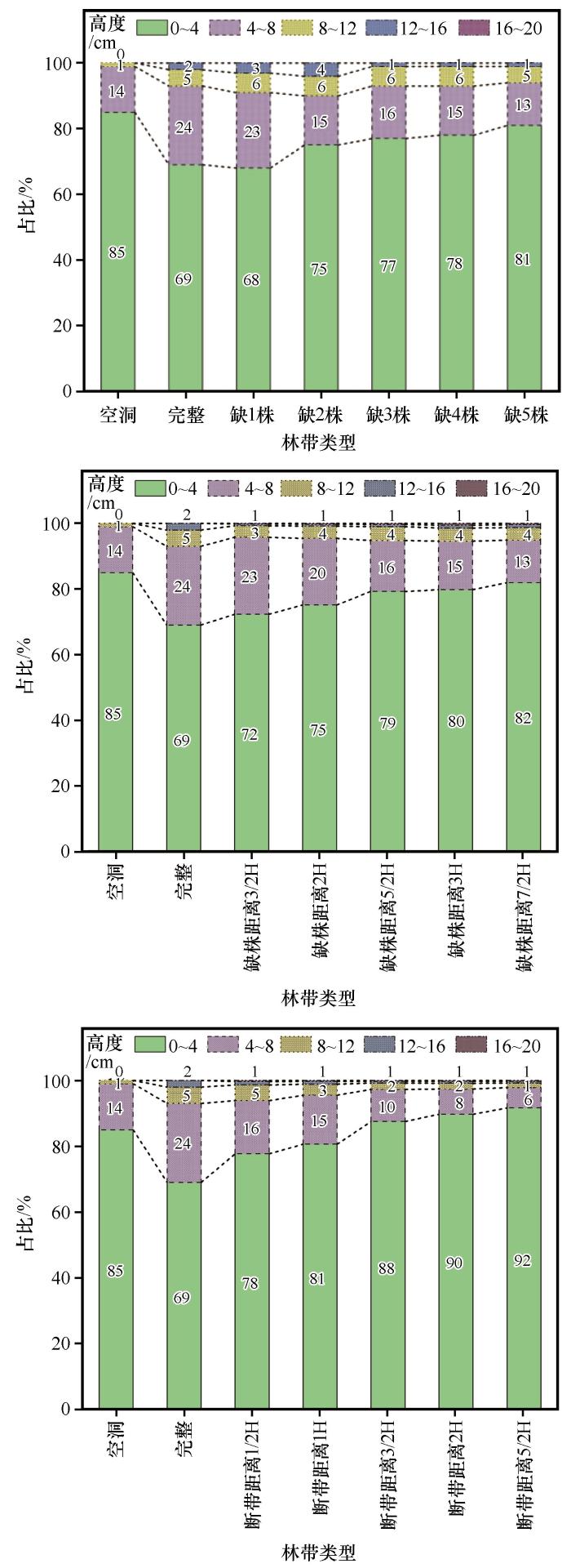 将集沙高度分为5个集沙区间进行分析统计(图3 ),间隔高度值分别为0~4、4~8、8~12、12~16、16~20 cm。在0~4 cm高度,无林带的空洞、完整结构林带和其他结构林带的输沙通量占总输沙通量的比例均超过68%;不同缺株数量林带的输沙率占比68%~81%,不同缺株距离林带的输沙率占比为72%~82%,不同断带距离林带的输沙率占比为78%~92%,其中完整林带和缺1株林带占比最低(68%~69%),随缺株数增加、缺株距离增加、断带距离增加,输沙通量0~4 cm占比增加,4~8 cm输沙通量占比随缺株数增加、缺株距离增加、断带距离增加占比减小,说明相较于空洞,不同缺株数量和缺株距离的林带近地层沙物质含量占比显著降低,说明林带对沙物质具有拦阻作用。对照无林带的空洞达到80%累积输沙高度为0~4 cm,完整林带、缺株1~4株的林带、缺株距离3/2~5/2H的林带、断带1/2H的林带累计输沙率达到80%的距地高度为4~8 cm,说明林带区域有效抑制了地表风沙活动,并抬升了风蚀基准面;缺株≥5株的林带、缺株距离≥3H的林带、断带距离≥1H的林带的80%累计输沙率距地高度为0~4 cm,说明林带对近地表风沙活动控制较弱,甚至加强,影响不容忽视。