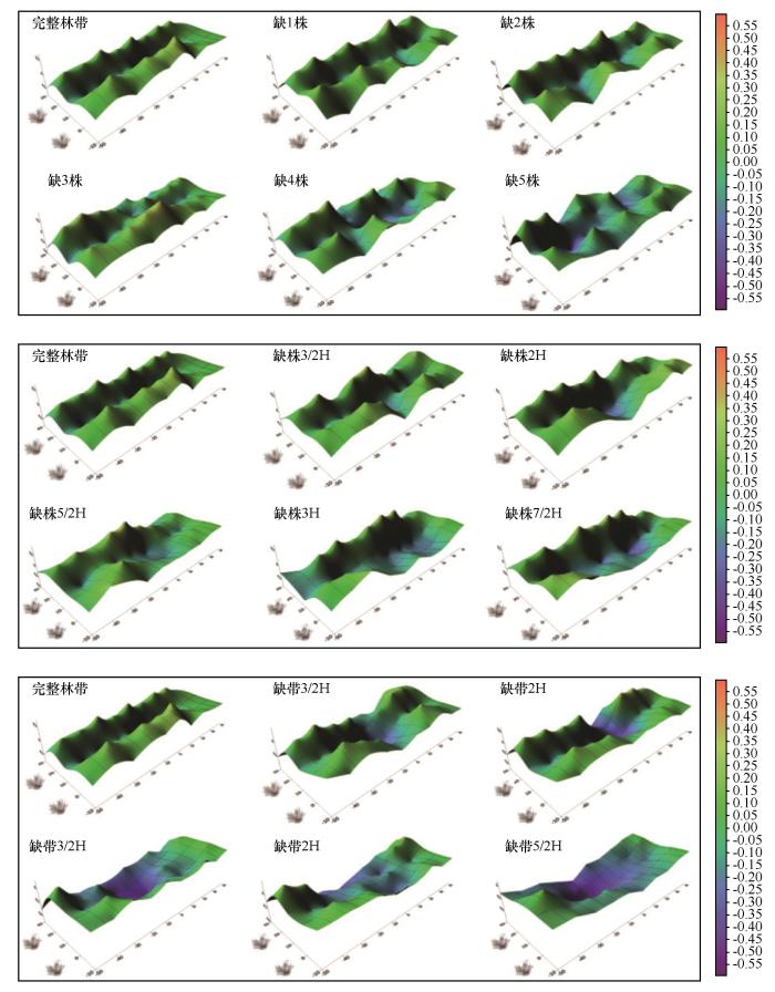 -9.43、-18.76、60.44、131.63 cm3 ,风蚀范围占比随缺株数量增加而增加,从40.36%增至72.98%;风蚀量随着缺株距离的增加而增加,不同缺株距离的风蚀量为-40.61、-7.86、38.93、108.92、107.89 cm3 ,风蚀范围占比为42.19%、40.53%、44.89%、57.50%、61.47%;随着断带距离的增加,风蚀量呈现增加趋势(69.86、95.24、214.62、473.18、662.36 cm3 ),风蚀范围占比也呈增长趋势(36.20 %、51.69%、55.53%、69.65%、79.07%、98.01%)。由此可见,当林带缺株数≥5株、林带缺株距离≥3H、林带断带距离≥1H时,风蚀量对比完整林带增加超200%,且风蚀范围占比超过50%,这表明随着林带结构完整性程度减弱,风蚀作用严重,当林带完整结构受损达到林带缺株数≥5株、林带缺株距离≥3H、林带断带距离≥1H时,风沙的侵蚀作用主导了地表的风沙变化。