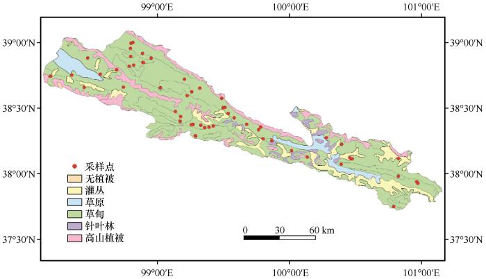 黑河源区地处青藏高原东北部,面积约1.6×104 km2 。海拔2 257~5 235 m,属高原大陆性气候,年均温-4.7~1.2 ℃,年降水量约400 mm[18 ] ,年蒸发量1 496 mm。地形以山地为主,植被垂直分异明显,植被类型多样[19 ] ,高寒草甸面积占比最大(图1 )。成土母质主要为风积黄土和岩石风化物[20 ] ,土壤类型以草毡土和黑毡土为主。