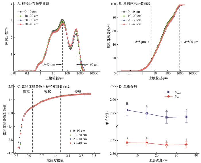 土壤PSD频率曲线可以反映土壤质地情况,曲线分布越均匀则颗粒异质程度越大[1 ] 。高寒草甸各土层土壤PSD频率曲线均呈双峰型且变幅较大,表明高寒草甸土壤PSD呈明显的非均匀性(图3 )。高寒草甸土壤PSD频率曲线主峰在10~100 μm,峰值在45 μm;次主峰200~800 μm,次峰值出现在480 μm。随土层深度增加,土壤PSD频率曲线变幅减小,颗粒异质程度增大。高寒草甸土壤颗粒集中分布在5~800 μm粒径,表明高寒草甸土壤质地整体较粗。高寒草甸0~40 cm土壤颗粒累积体积分数与粒径的双对数拟合结果表明,两者之间整体呈非严格线性关系,表现出3个尺度域,即黏粒域、粉粒域和砂粒域,其边界大致对应美制标准的黏粒、粉粒和砂粒的界限。为提高不同尺度域边界两侧的线性拟合效果,经过优化调整后,各土层黏粒域与粉粒域的边界范围为1.9~2.5 μm,拟合优度R 2 为0.95,而粉粒域与砂粒域的边界范围为52.3~91.2 μm,R 2 为0.86。0~40 cm粉粒域(D silt )的分形维数均值为2.33,砂粒域(D sand )的分形维数均值为2.84,总体上,D silt 和D sand 随土层深度增加呈减少趋势(P >0.05)。