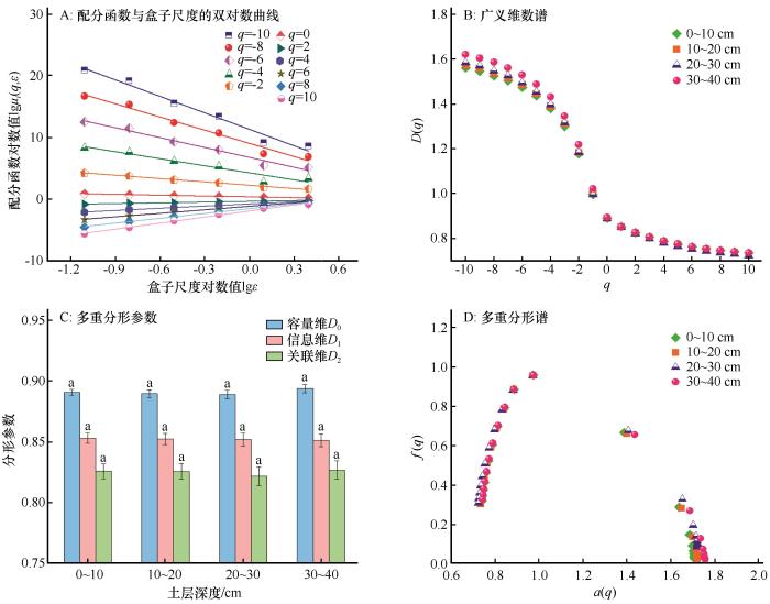 配分函数与盒子尺度的双对数关系是否呈线性,是判断研究对象在特定尺度范围内是否具有多重分形特征的重要依据[26 ] 。配分函数与盒子尺度的双对数关系呈现出明显的线性趋势(图4 ),表明高寒草甸土壤具有多重分形特征。土壤广义维数谱D (q )在-10≤ q ≤10变化,D (q )随步长q 的增大而递减。当q <0时,0~40 cm D (q )的变化幅度依次为0.565、0.573、0.588和0.598,表明土壤分形结构的复杂程度随土层深度的增加而增加;当q >0时,D (q )随土层深度的变化幅度依次为0.155、0.159、0.164、0.158,说明表层土壤PSD的非均匀性小于深层土壤。整体上看,q <0时D (q )的下降趋势较q >0时更明显,说明D (q )在稀疏区域更为敏感。D 0 和D 1 分别为容量维和信息维,D 0 、D 1 越大表明土壤PSD范围越广且异质性越大。0~40 cm D 0 、D 1 分别为0.889~0.894、0.851~0.853,表明高寒草甸土壤PSD范围较广且异质性较大。D 2 为关联维,该值越大则土壤PSD越均匀,0~40 cm D 2 为0.822~0.827,均值为0.825,表明土壤PSD均匀性较低。多重分形谱的形状及其对称性能反映土壤PSD的非均匀性,高寒草甸土壤PSD多重分形谱呈左勾上凸状,表明土壤PSD大概率子集占主要地位。