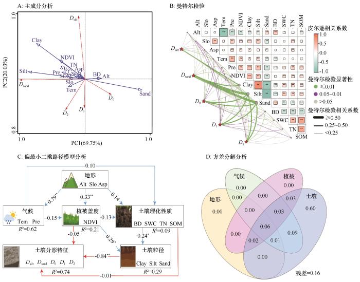 使用SPSS 25软件中的单因素方差分析方法比较不同土层深度土壤理化性质、分形维数的差异性,使用Duncan's进行差异显著性检验[23 ] 。使用Canoco5软件进行主成分分析(Principal component analysis, PCA),研究土壤分形特征与影响因子的关系。使用R软件(Version 4.3.0)中的linkET包进行Mantal test分析,研究土壤分形特征与影响因子的显著性关系。使用R软件中的plspm包建立偏最小二乘路径模型(Partial-least-squares path modeling, PLS-PM),揭示影响因子间的内在作用对土壤分形特征的驱动作用[24 ] 。使用R软件中的vegan包进行方差分解分析(Variance partition analysis,VPA),量化定地形因子、气候因子、植被因子、土壤理化因子对土壤分形特征的解释程度[25 ] 。