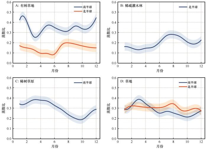 ... [53],印证了区域水分限制下植被蒸散作用普遍受限的特征[41].不同植被类型的蒸散比呈现显著分异 [53],其中,稀树草原的蒸散比季节波动最大(Cv=0.65),这可能与其独特的旱雨季交替模式密切相关[54].尽管深根系可能缓解旱季水分胁迫(通过汲取深层土壤水分)[55-56],但雨季降水的波动性仍可加剧蒸散比波动;相对而言,草地较稳定的表层水分供给使其波动性最低(Cv=0.43),凸显植被水分获取策略对蒸散动态的调控作用 [57]. ...