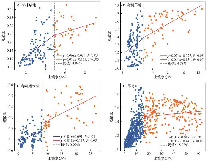 ... 干旱半干旱区覆盖全球陆地表面积的41%,承载约38%的人口[26],稀树草原、灌丛和草地作为该地区的典型景观类型,对气候变化具有高度敏感性[27].土壤水分是该区域蒸散发的主要限制因子[28],临界土壤水分阈值被定义为土壤水分降至某一临界值时,蒸散发开始减少并进入水分胁迫状况 [29].当土壤水分低于阈值时,蒸散发减少导致感热通量增加、地表温度升高及大气干燥度加剧 [30-31],进而通过能量再分配影响碳吸收等生态过程[32].此外,气候变化可能通过阈值效应引发生态系统功能的突变式响应,而非渐进式调整[33].因此,准确量化干旱半干旱区植物水分胁迫下的临界土壤水分阈值对于理解生态系统的水文-能量相互关系及其功能变化具有重要意义. ...