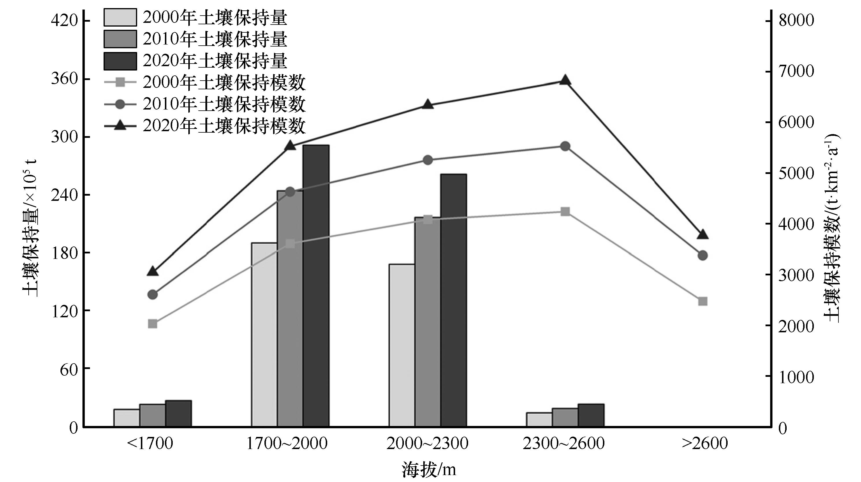 | 图6 2000—2020年不同海拔的土壤保持量和土壤保持模数 |