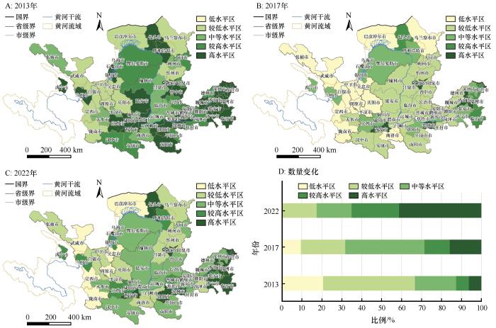 ... 通过熵值法可计算得出2013—2022年黄河流域63个地市生态旅游发展指数,根据极值、用等距间隔法可将生态旅游发展划分为高、较高、中等、较低、低水平5个等级类型[40 ] .从时间演化特征看,黄河流域生态旅游发展呈整体上升、结构优化的显著特征(图1 A~C).流域整体生态旅游发展指数均值从2013年的0.145提升至2022年的0.248,年均增长率为5.29%,这表明黄河流域生态旅游发展保持良好增长势头,这与国家生态文明建设战略深入推进、黄河流域生态保护和高质量发展上升为重大国家战略密切相关.需要指出的是,本研究基于熵值法所构建的生态旅游评价体系和所得数值主要体现的是区域间比较优势而非发展绝对水平.从数量结构变化看,生态旅游发展经历由橄榄形向倒三角形结构演进(图1 D).2013—2022年低水平区实现历史性清零,较低水平区大幅收缩,由29个减少至11个,此外,高水平和较高水平区则从4个分别增至26和15个,呈爆发式增长特征,这种结构演进表明出黄河流域生态旅游发展由低水平均衡向高水平优化的跃迁过程,部分城市已突破生态旅游发展的临界阈值,实现从要素驱动向创新驱动的发展模式转变. ...
