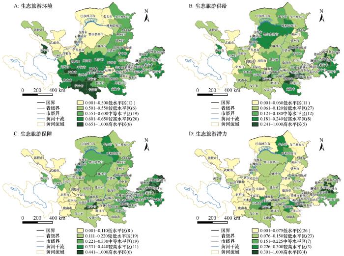 以2013—2022年生态旅游发展各分维度均值为分析依据,对其进行ArcGIS地图呈现(图2 ),4个细分维度呈现模式多元且形态差异的分异格局。生态旅游环境维度表现为资源主导、边缘分布的空间格局(图2 A),高水平区集中在西安、汉中、安康、铜川、天水等生态条件优越的边缘城市,这些地市多位于秦岭、祁连山等重要生态功能区,远离高强度经济活动区域,保持相对原始的自然生态系统。包头、鄂尔多斯、乌海等传统重工业城市由于长期承担资源开采和工业生产功能,生态环境均位列低水平区,这表明在生态文明建设背景下传统资源型城市面临发展模式转型的迫切需求。生态旅游供给维度呈现出典型的核心-边缘分布特征(图2 B),高水平区几乎被太原、济南、郑州、洛阳、西安等省会城市垄断,这些城市凭借其政治中心和资源配置优势,在基础设施、服务体系、产业投资等方面具有先发优势。较低水平区多达27个地市,主要分布于黄河上中游的边缘地区。