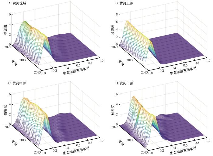 上、中、下游地区在总体演进趋势上具有一致性,但在具体形态上表现出区域异质性。从共性特征看,三大流域段的核密度曲线均向右移动,与流域整体演进方向一致,表明各流域段生态旅游发展水平均有不同程度提升。各流域段核密度曲线主峰高度普遍下降、宽度逐步扩大,流域内部各区域地市生态旅游发展的绝对差异均呈扩大趋势。从差异化特征看,黄河下游地区核密度曲线右拖尾最为明显(图5 D),反映出济南、郑州等省会城市和经济发达地市在生态旅游发展方面的显著优势,这主要得益于下游地市雄厚的经济基础和较强的市场需求;上游地区核密度曲线右侧逐渐趋于平缓,无明显双峰现象(图5 B),这说明基于对西部地区生态保护和绿色发展的政策倾斜,基础设施投资力度的不断加大,该区生态旅游两极分化得以改善。