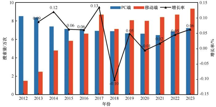 从搜索端口结构看,生态旅游网络关注度呈现出清晰的“双线交叉”演化特征。移动端网络搜索量占比从2012年的14.93%提升到了2023年的56.34%,成为了黄河流域生态旅游网络关注度的主要渠道。2017年,移动端搜索量首次超过PC端,此后持续保持了领先位置,搜索渠道的此消彼长反映了数字技术变革对旅游信息获取方式的重构。究其原因在于,在互联网时代新生代游客占比不断提升,“90后”和“00后”已成为生态旅游消费的新生力量,其信息获取高度依赖于移动设备。其次,碎片化时间利用价值提升,移动端满足了旅游者随时随地获取生态旅游信息的需求。再次,旅游企业数字化转型加速,流域内诸多生态旅游景区大力发展小程序、短视频和直播等移动端营销渠道,有效引导了用户搜索行为的迁移。