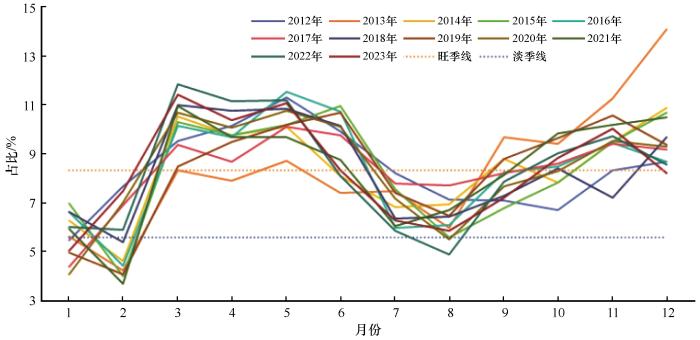 ... 借鉴周成等[29 ] 、秦宏瑶等[30 ] 相关成果,以全年关注度的1/12(8.33%)、1/18(5.55%)为判断标准,大于8.33%为旺季,小于5.55%为淡季,二者之间为平季.由图2 可知,2012—2023年黄河流域生态旅游网络关注度呈现显著的“双峰型”季节波动特征,且两峰之间呈现不对称.具体而言,3—6月的平均网络关注度在全年占比达39.91%,显著高于旺季线,构成全年的第一个高峰期,其中5月表现尤为突出,成为春季生态旅游的关注焦点,该时期生态旅游关注度较高与黄河流域春季气候宜人、生态系统恢复活力、“五一”长假旅游规划需求增长等多重因素密切相关.7—8月网络关注度处于低谷时期,平均值下降至6.58%,与全年峰值月份形成显著对比,原因可能在于,夏季黄河流域高温天气因素对生态旅游活动产生一定的抑制作用,暑期旅游市场的多元化和目的地激烈竞争分散了对该区域生态旅游的专注度. ...