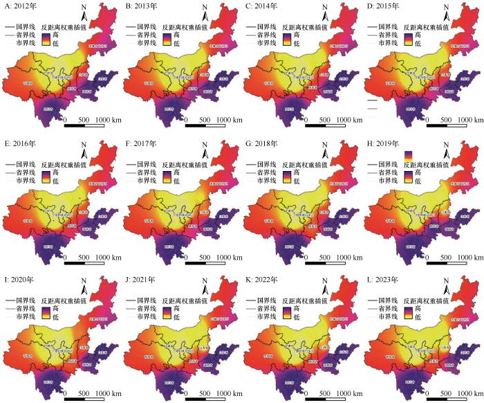 反距离权重插值(IDW )以地理学第一定律为假设,将内插点与样本点之间的距离设为权重参数进行加权平均[28 ] ,能较直观地呈现黄河流域生态旅游差异演化的空间格局。