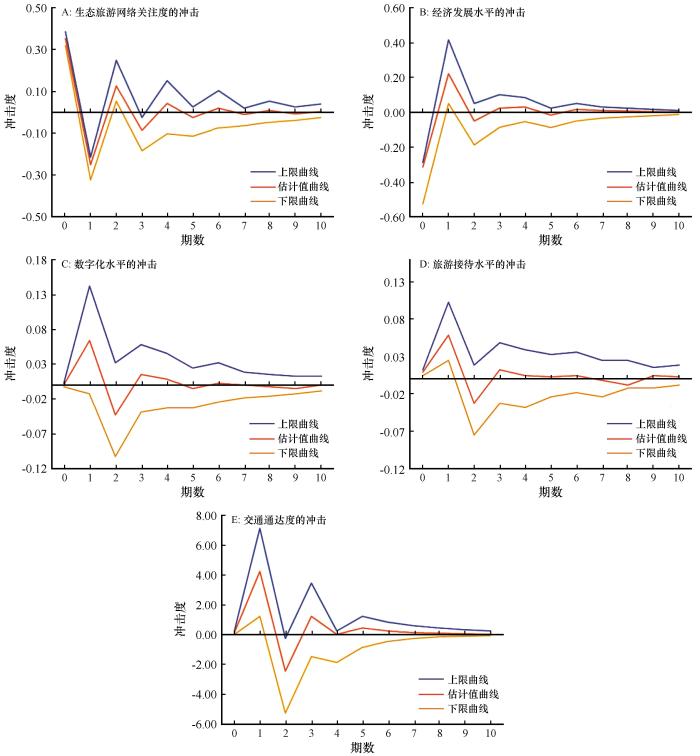 ... 空间联系在网络关注度转化为实际旅游行为中扮演着关键角色.交通通达度(X 4 )刻画了生态旅游目的地的可达能力和吸引半径,本研究以区域铁路、内河航道、公路总里程加以表征.资源禀赋则是生态旅游网络关注度形成的核心要素,生态旅游资源(X 5 )是生态旅游地形成吸引力的根本所在,国家级自然保护区、森林公园等高品质生态空间不仅代表了区域生态资源的丰富程度,也是生态旅游产品开发的基础.借鉴段雪岩等[34 ] 、高玉娟等[35 ] 的研究成果,用国家级自然保护区、森林公园、生态文明建设示范区以及“绿水青山就是金山银山”实践创新基地数量衡量生态旅游资源因素.进一步,运用SPSS统计软件进行Pearson相关性分析,识别各因素与网络关注度之间的相关强度和显著性水平.其次,构建面板向量自回归(PVAR)模型,以深入探究各影响因素对网络关注度的动态作用机制和传导路径. ...