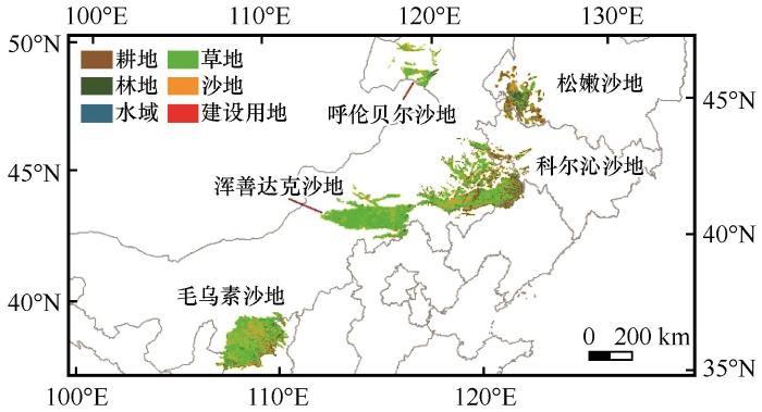 ... 毛乌素沙地、浑善达克沙地、科尔沁沙地、呼伦贝尔沙地和松嫩沙地(37°27′—49°50′N,107°20′—126°02′E),总面积16.73万km².其中,毛乌素沙地年降水量250~420 mm,年平均气温6.0~8.5 ℃,风沙地貌以新月形沙丘和沙丘链、固定梁窝状沙丘为主,主要植被有沙蒿(Artemisia salsoloides)、小叶锦鸡儿(Caragana microphylla)、筐柳(Salix linearistipularis)和沙棘(Hippophae rhamnoides)等;浑善达克沙地年降水量140~380 mm,年平均气温3.0~5.0 ℃,风沙地貌类型以草灌丛沙堆、半固定梁窝状沙丘为主,主要植被有白榆(Ulmus propinqua)、小红柳(Salix microstachya var. bordensis)、黄柳(Salix gordejevii)、蒙古栎(Quercus mongolica)、沙米(Agriophyllum arenarium)、沙蒿、小叶锦鸡儿、大针茅(Stipa grandis)和冰草(Agropyron cristatum)等;呼伦贝尔沙地年降水量280~350 mm,年平均气温为0~2.0 ℃,风沙地貌类型以风蚀坑及坑后抛物线形沙丘为主,植被主要包括针茅(Stipa capillata)、羊草(Leymus chinensis)、线叶菊(Filifolium sibiricum)、冷蒿(Artemisia frigida)和糙隐子草(Cleistogenes squarrosa)等;科尔沁沙地年降水量200~500 mm,年平均气温6.0~7.5 ℃,风沙地貌类型以格状沙丘和沙丘链、新月形沙丘和沙丘链、草灌丛沙丘为主,主要植被有羊草(Leymus chinensis)、冷蒿、蒙古栎、榆(Ulmus pumila)、小叶锦鸡儿、狗尾草(Setaria viridis)等;松嫩沙地年降水量360~480 mm,年平均气温3.3 ℃,风沙地貌类型以裸沙斑块为主,植被主要包括榆、大果榆(Ulmus macrocarpa)、山杏(Armeniaca sibirica)、细叶胡枝子(Lespedeza juncea var. subsericea)、大籽蒿(Artemisia sieversiana)、狼针茅(Stipa baicalensis)和糙隐子草等[29].行政区划上隶属黑龙江、吉林、辽宁、内蒙古、陕西、宁夏等省区(图1).2024年,典型沙地中,草地、沙地、耕地、林地、水域和建设用地面积分别为81 859.89(占典型沙地总面积的48.93%)、42 594.58(25.46%)、28 524.65(17.05%)、7 545.23(4.51%)、3 747.52(2.24%)、3 044.86 km²(1.82%). ...