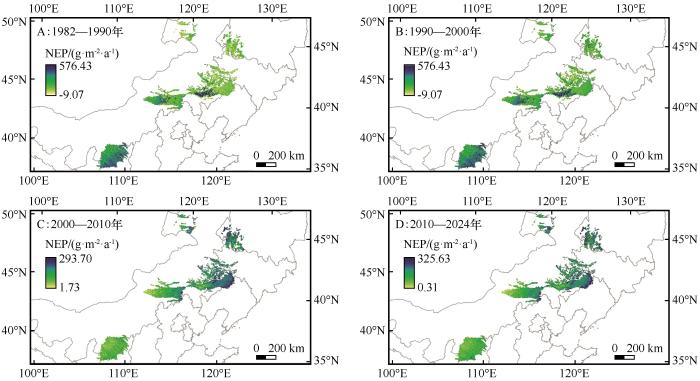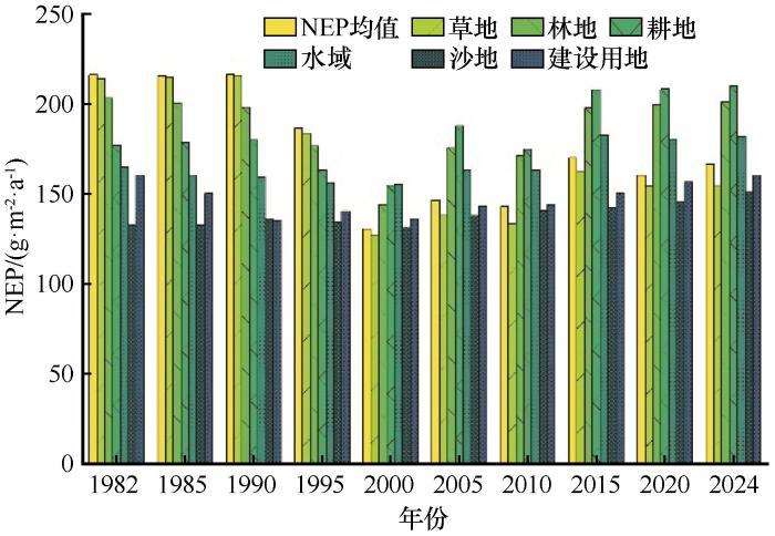 ... 本文所用遥感数据包括1982—2024年1 km月最大合成中分辨率成像光谱仪(MODIS)归一化植被指数(NDVI)数据,来源于国家地球系统科学数据平台(https://ladsweb.modaps. eosdis.nasa.gov).土地覆被产品来源于谷歌地球引擎(GEE)平台,并利用中国土地利用数据集(https://www.resdc.cn)对1982、1985、1990、1995、2000、2005、2010、2015、2020、2024年土地利用数据进行校正和重分类,该数据底图空间分辨率30 m.近期研究表明,人口密度和单位面积地区生产总值是NEP变化的主控因素[30-32].因此,本文选取同期的该类数据用于分析人为因素贡献率,数据来源于中国科学院资源环境科学与数据中心(http://www.resdc.cn).利用ArcGIS(v.10.2)对月平均气温和月降水量数据进行最大值合成,并对数据进行克里金插值[33].CASA模型[34]能够利用遥感数据精确估算大尺度地区的植被光合作用和生态系统生产力,从而提供碳循环和气候变化研究的重要信息;Thornthwaite Memorial模型[35]具有广泛的适用性,适用于大范围区域和缺乏详细生物物理数据的情况下,能够通过气候数据提供可靠的NPP估算,特别适合进行气候变化的长期分析.以上模型是学术界广泛采用的NPP估算方法,在不同地区和时间尺度上具有适用性和有效性.本文即利用CASA计算实际NPP(ANPP),利用Thornthwaite Memorial模型,基于年均实际蒸散量计算潜在NPP(PNPP).基于残差趋势法[36]计算人为主导的NPP(HNPP),利用土壤微生物异养呼吸模型[37]计算NEP,最后使用斜率法[38]分析NEP变化趋势,并定量分离气象与人为因子的贡献率. ...