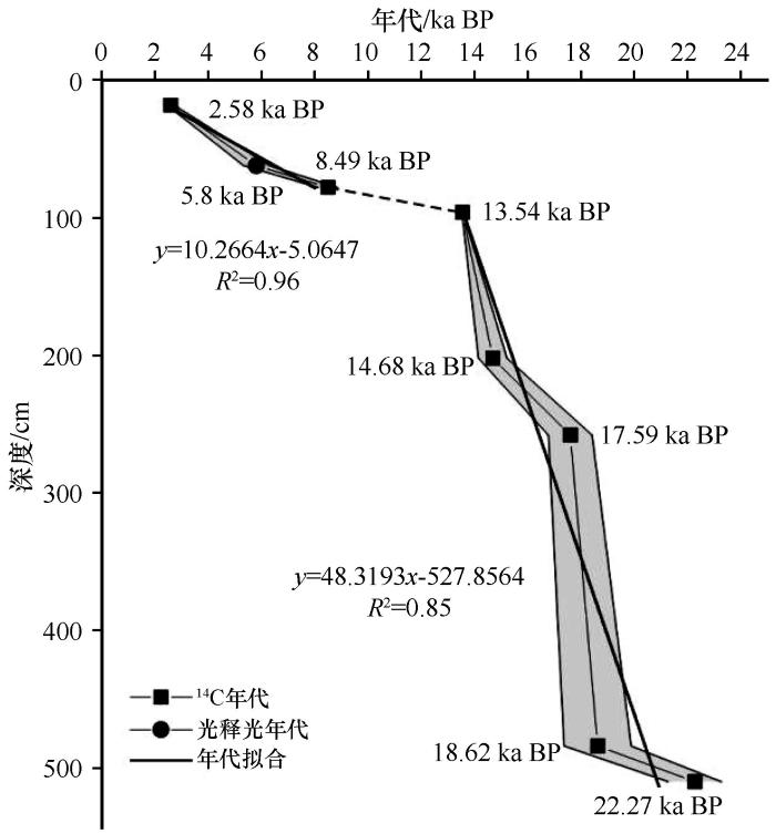 ... 年代测定.14C和OSL年代测定由中国科学院地球环境研究所加速器质谱中心完成.14C测定前需进行预处理,将样品取出过筛后放入烧杯,分别加入10 mL浓度为10%的H2O2和HCl溶液,置于电热板加热直至无气泡产生,用于去除有机质和碳酸盐.然后,加入2%的NaOH溶液碱洗以去除腐殖酸;再次加入HCl将沉淀物洗至中性以获得胡敏酸.最后,在真空中将烘干的样品加入氧化铜被氧化成CO2,制成的石墨靶用于加速器测年.14C测年结果利用IntCal20进行校正[23].OSL年代测定需在暗室红光条件下,将预处理后的样品用35%的H2SiF6浸泡两周左右以去除长石矿物,而后光释光仪测定. ...