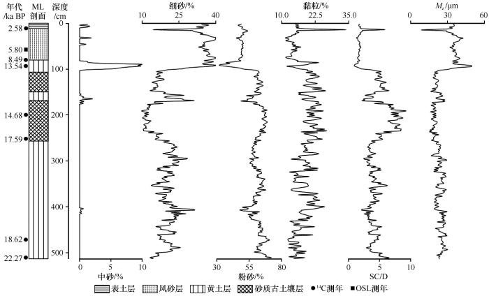 ... SC/D值旨在放大沉积物中粉砂和黏粒之和与砂粒的比例关系,可更好地反映地质历史时期的风沙活动[5].一般而言,SC/D值越小,说明冬季风强盛,气候冷干,风沙活动影响显著;反之,风沙活动较弱或存在成壤过程.ML剖面SC/D值的范围在0.98~9.24,均值为4.28.其随深度变浅整体呈降低趋势,存在显著的两峰.平均粒径(Mz)是搬运介质动能的体现,其值越大,冬季风越强势.Mz为8.98~50.95 µm,均值为29.96 µm,其在ML7~ML3随深度变浅呈降低趋势. ...