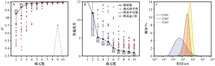 ... [7],在形状上有很大的灵活性并且能很好地控制偏度[25].决定系数(R2)表示数据的拟合程度,角度偏差可反映曲线形状的拟合偏差程度,端元相关度表示的是端元间是否存在过度拟合.端元一般以R2>0.8、角度偏差<5°、端元相关度较小以及数量最少的原则选取. ...