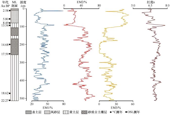 ... 色度是定性描述古气候和土壤发育程度重要理化指标[26].其中,红度a取决于沉积物中磁铁矿和赤铁矿的含量,高值指示暖湿的环境条件[26].ML剖面红度a的垂直变化如图5所示,其值为5.78~7.82,总体随深度变浅呈降低趋势,高值区对应砂质古土壤层,低值区对应风砂层,黄土层介于二者之间. ...