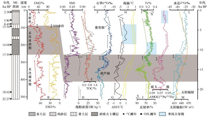 ... 注:A:EM2;B:EM3;C:青海湖1Fs岩芯SMI[38];D:哈拉湖HL13B岩芯孢粉浓度[39];E:茶卡盐湖TOC[49];F:董哥洞和葫芦洞石笋δ18O[40,50];G:W-E赤道太平洋的∆SST[44];H:西太平洋海温[44];I:阿拉伯海Ti元素[55];J:卡里亚科盆地反射率[45];K:AMOC强度[46];L:格陵兰冰芯NGRIPδ18O[47];M:65°N太阳辐射量[43] ...