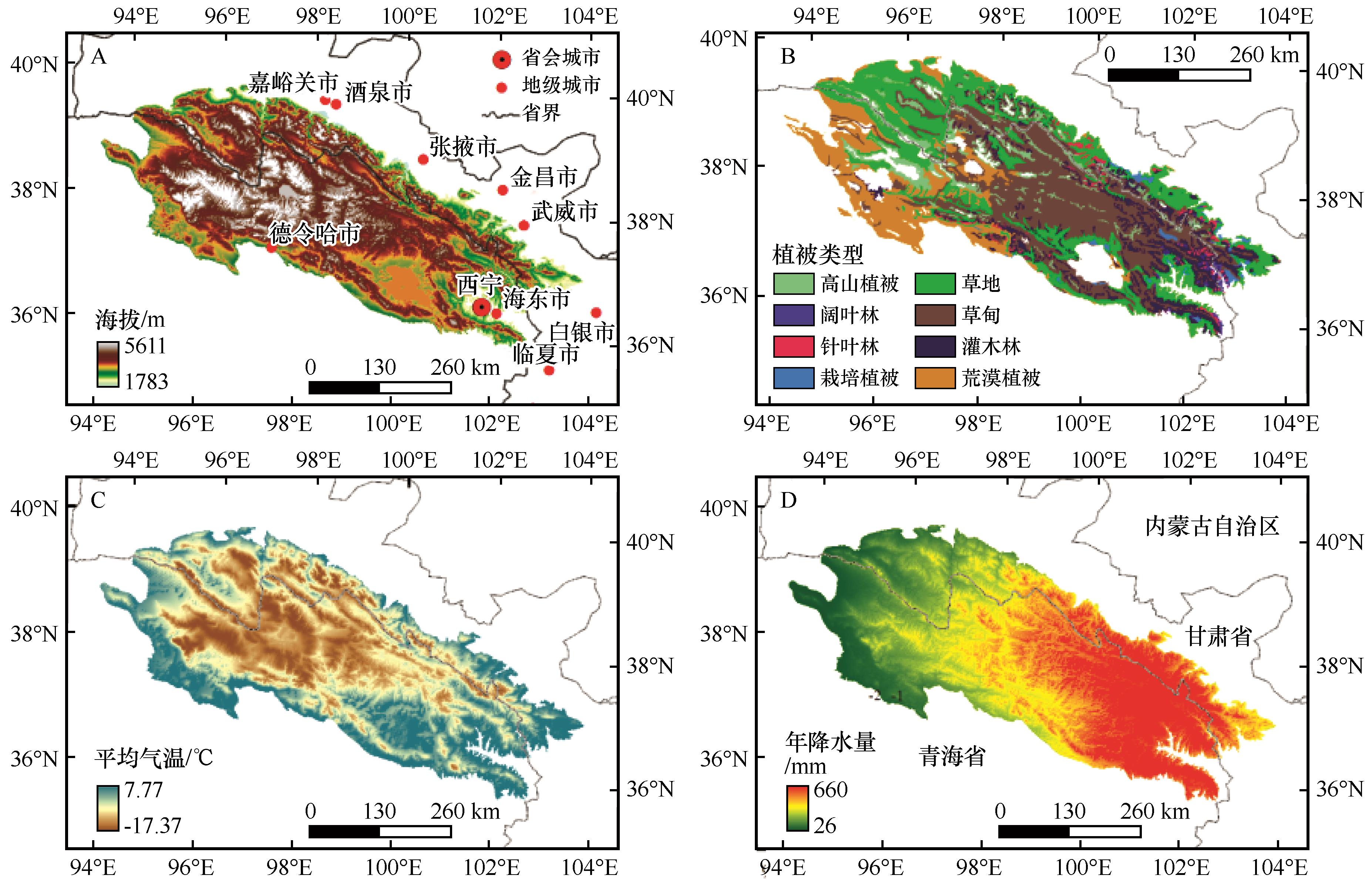 | 图1 研究区海拔、植被类型、多年平均气温和年降水量空间分布 |