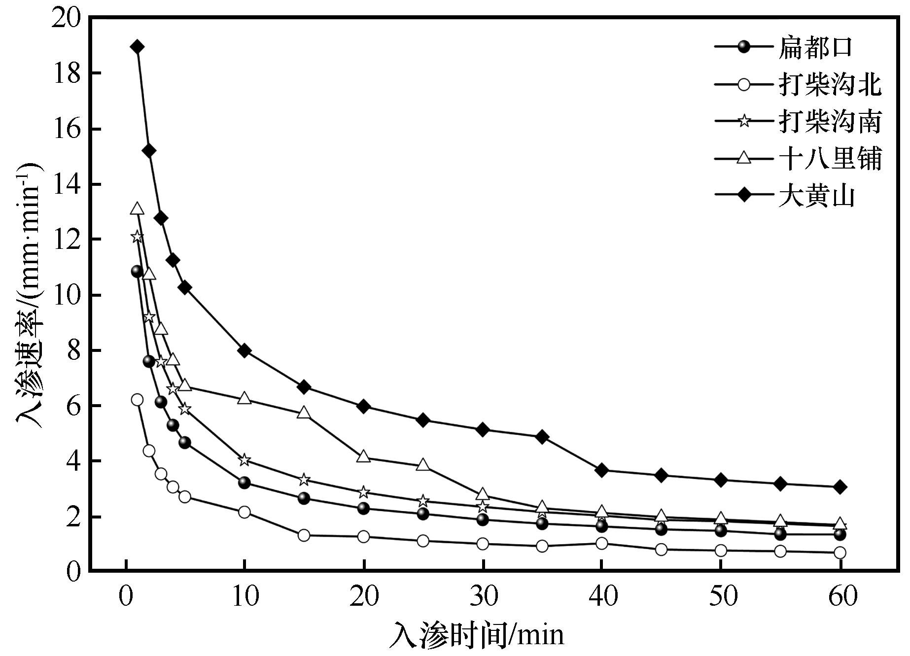 | Fig.1 Soil infiltration process curves under different plantation sites |
