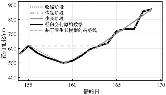 ... 基于零生长模型,通过寻找历史时期生长最大值的方法确定树木径向生长趋势线,并将生长趋势线与实测径向变化曲线的差值定义为树木水分亏缺(Tree Water Deficit, TWD),用于反映树木体内水分状况[25-26].根据TWD的增减,将径向变化过程划分为3个生理阶段:收缩阶段(TWD>0,且持续增大),反映了干旱导致树木水分损失加剧的过程;恢复阶段(TWD>0,且持续减小),反映了干旱后树木水分得到补给的过程;生长阶段(TWD=0),反映了树木的生长过程(图2).将径向生长在收缩过程结束后,开始恢复直至回到收缩起始状态的过程定义为一次恢复事件,将随后径向生长至下一个下降拐点之前的过程定义为一次生长事件.根据阶段划分,结合各次事件的持续时间和变化量,使用最小二乘法计算各阶段、各事件的变化速率. ...