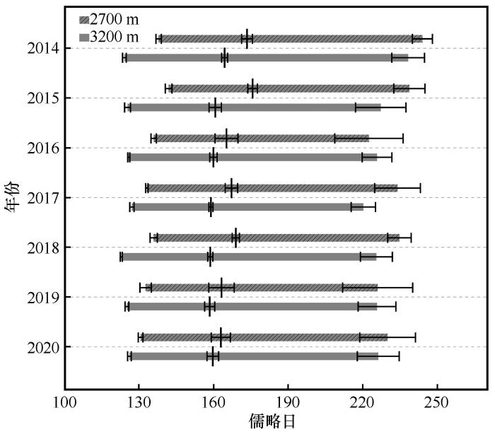 ... 先前的研究普遍认为最大生长速率往往出现在夏至日附近,与光周期密切相关[37-38].然而,本研究发现,2 700 m处树木的最大生长速率在夏至之前出现,而3 200 m处的大多数树木的最大生长速率则在夏至之后出现,这可能是由于不同海拔高度的水热条件差异所致.对高海拔针叶树的研究发现,生长季后期可能会出现水分可利用性降低的状况,树木会提前最大生长速率的出现时间[39].对榛子(Corylus avellana)的研究发现,最大生长速率出现在夏至日前的5周,这种过早达到峰值的生长模式是由于其光饱和点较低,提前进入生长旺盛期来高效利用春末夏初适宜的光照条件,从而规避夏季强光造成的光合效率下降[40-41].对挪威云杉(Norway spruce)的研究表明,最大生长速率发生在夏至日之后,这与最高气温出现时间相吻合[42].此外,另一些研究表明最大生长速率的出现时间会随着海拔的降低而呈提前趋势[43].因此,基于先前的发现与本研究结果,可以推断光周期可能控制着最大生长速率出现的大致时间,但温度、水分条件以及光饱和点等因子会精细化地对其产生影响. ...