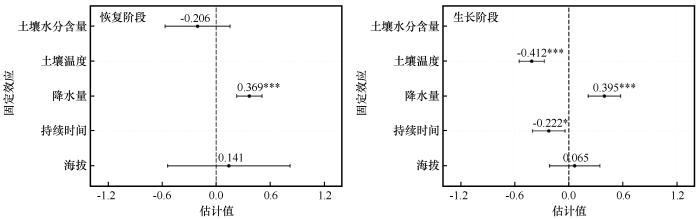 ... 树木在经历干旱事件后的恢复与生长过程,反映了其应对环境压力的生理调节机制.本研究发现青海云杉径向生长对干旱的响应存在显著的海拔分异.高海拔样地恢复事件数量更多,反映其对水分改善响应更敏感,径向变化更频繁;而低海拔样地恢复事件数量虽少但变化速率略高,显示其在水分胁迫缓解后具备更快的径向变化恢复能力.因此,在恢复阶段高海拔青海云杉表现出更高的水分敏感性,而低海拔个体则具有更强的恢复力.同时,低海拔样地的生长事件数量更多且径向变化速率更高,表明其在水分条件改善后能迅速提高细胞扩张速率,实现快速生理恢复,对水分波动响应更为敏感;相比之下,高海拔样地变化速率较缓,而生长持续时间占比略高,反映其径向生长更为稳定.因此,在生长阶段低海拔青海云杉表现出更高的水分敏感性,而高海拔则更具抵抗力.这一结果印证了前人关于树木抵抗力随海拔升高而增强的结论[45],但本研究进一步揭示了不同阶段间的差异化响应,反映了树木应对干旱的阶段性及多维性适应特征,这种差异化响应主要受不同阶段、不同海拔的主导环境因子驱动.线性混合效应模型表明,恢复阶段主要由降水事件主导,其通过改善冠层微环境、快速缓解蒸腾胁迫来促进恢复[46];而生长阶段则受水热因子的协同调控,土壤温度的升高会通过增强蒸散作用对径向生长产生显著抑制[47-49].线性拟合结果进一步揭示了主导因子的海拔差异:恢复阶段,低海拔对降水更敏感[46,50],而高海拔对土壤水分含量响应更强[51-52];生长阶段,高海拔和低海拔均对平均气温敏感[53-54].这说明青海云杉的生长在不同海拔均高度依赖水分条件,但主导因子各异,证实了气候变暖正强化高海拔树木对水分依赖的观点[55-56]. ...