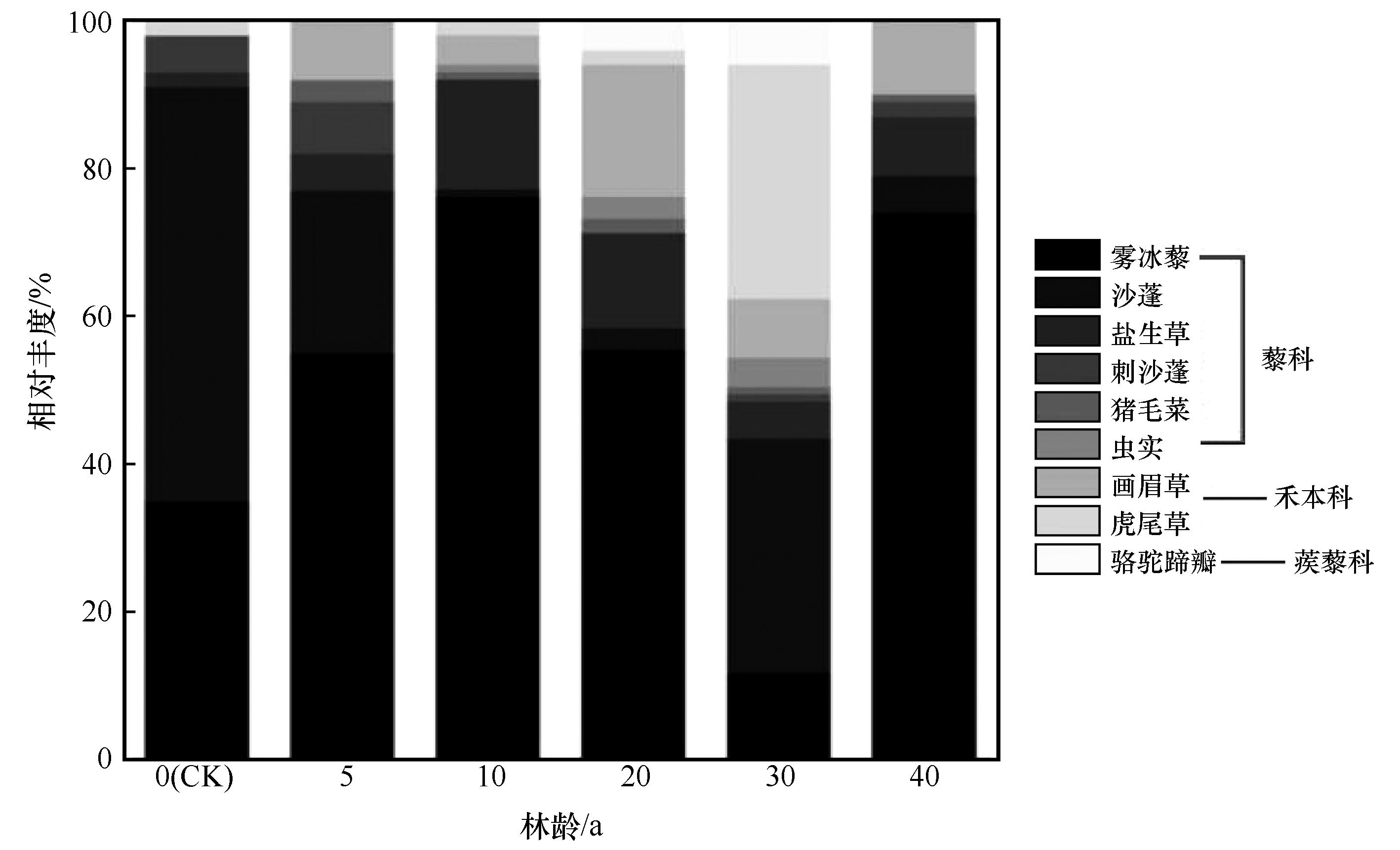 | Fig.4 Relative abundance of understory herbaceous plants in Haloxylon ammodendron woodland of different ages |