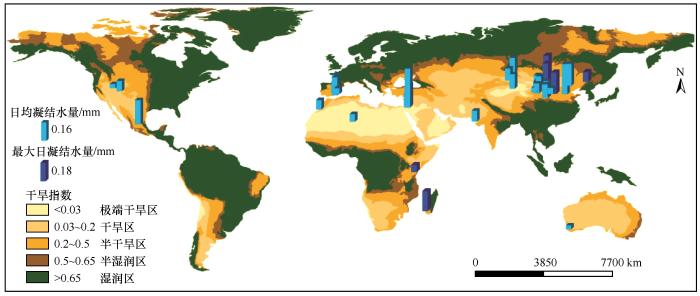 ... 干旱半干旱区的面积超过全球陆地面积的三分之一,占中国陆地面积的一半以上.在全球变暖的背景下,干旱半干旱区的面积可能仍会持续扩大[1-2].在以水分因子为主要限制条件的生态系统中,凝结水量较少,但发生频率较高[3],是持续干旱条件下生态系统的重要水分补给来源[4].凝结水不仅对植物、小型土壤动物和微生物的存活以及种子的萌发起到关键作用[5-8],还是干旱区生物土壤结皮生长发育的主要水分来源[9-10],并对生态系统的水热平衡产生一定影响[11-15].凝结水的形成改善了植物的水分状况,增加了植物可利用的水分,提高了植物的光合速率和生物量[7].干旱区小型土壤动物通过特定的生理结构和行为收集并利用凝结水[8,16].印度班加罗尔地区的聚纹双刺猛蚁利用羽毛等吸湿材料改造巢穴入口,促进凝结水的形成,进而通过收集这些材料间接获得水源.以色列的内盖夫沙漠,年凝结水量可占当地年降水量的53%[17].Lekouch等[18]在摩洛哥地区进行凝结水收集,结果表明该地区年凝结水量占年降水量的40%.中国塔克拉玛干沙漠[19]和腾格里沙漠沙坡头[20]的凝结水量分别占降水量的64%和11.46%~17.67%.因此,开展干旱区凝结水研究具有重要的生态水文学意义. ...