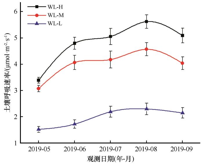 生长季不同水位梯度的湿地土壤呼吸速率季节变化趋势相似(图2 )。从5月开始,随着气温的逐步升高,植物逐渐萌发,微生物的活性也逐渐增强,WL-H、WL-M和WL-L水位带的土壤呼吸速率均逐渐增大。5月中旬,WL-H、WL-M、WL-L的土壤呼吸速率在植物生长季内均最小,最小值分别为3.39、3.07、1.52 μmol·m-2 ·s-1 。在8月中旬,气温较高,植物生长旺盛,根系和微生物呼吸较为活跃,3个水位带的湿地土壤呼吸速率均达到最大。WL-H、WL-M和WL-L的土壤呼吸速率最大值分别为5.62、4.56、2.3 μmol·m-2 ·s-1 。从8月中旬开始,气温逐渐下降,植物逐渐枯萎,土壤内植物根部呼吸强度减弱以及微生物活性降低,3个水位带的湿地土壤呼吸速率均随之降低。在生长季,地下水位越浅的地方,表层土壤水分越充足,植物根系越发达,因此,3个水位带的土壤呼吸速率均值大小排序依次为WL-H(4.79 μmol·m-2 ·s-1 )>WL-M(3.98 μmol·m-2 ·s-1 )>WL-L(1.98 μmol·m-2 ·s-1 )。总体上,不同水位梯度的湿地土壤呼吸速率表现为夏季最高、春季最低的生长季变化规律。