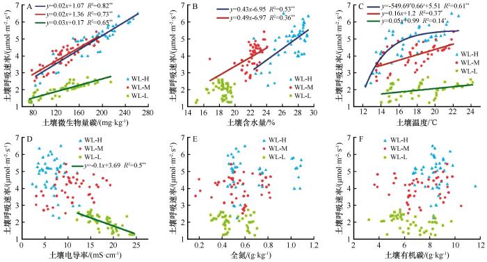 在高水位带(WL-H),湿地土壤呼吸速率与土壤微生物量碳、土壤含水量均呈极显著正相关关系(P <0.01),二者分别可以解释WL-H湿地土壤呼吸变异的82%和53%(图3 ),表明二者均对WL-H土壤呼吸速率具有显著促进作用。WL-H土壤呼吸速率与土壤温度呈极显著指数函数关系(P <0.01),土壤温度可以解释WL-H土壤呼吸变异的33%,表明土壤温度的增加也对WL-H土壤呼吸速率具有促进作用。但是,WL-H土壤电导率、全氮和有机碳均与土壤呼吸速率关系不显著(P >0.05)。